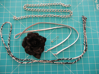I made this necklace using bits of leftovers from other craft projects. The chain came from a thrifted belt, the satin ribbon I cut off an UO shirt (too frilly), and the b&w ribbon was a belt for a sundress. The black rose pin I bought on clearance forever ago.